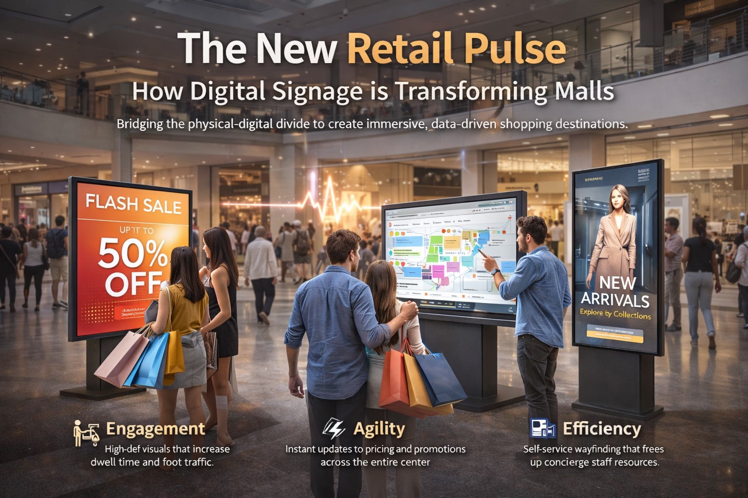 Discover how digital signage transforms shopping malls through real-time promotions, personalization, wayfinding, and immersive retail experiences.