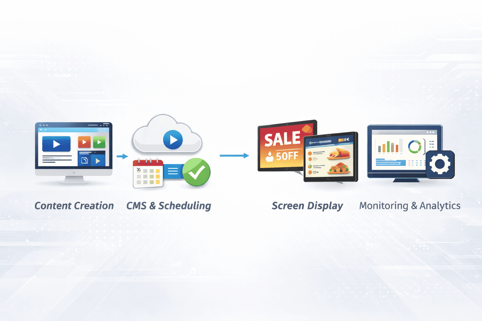 Content Creation → CMS Upload → Scheduling & Automation → Media Player Sync → Screen Display → Monitoring & Optimization
