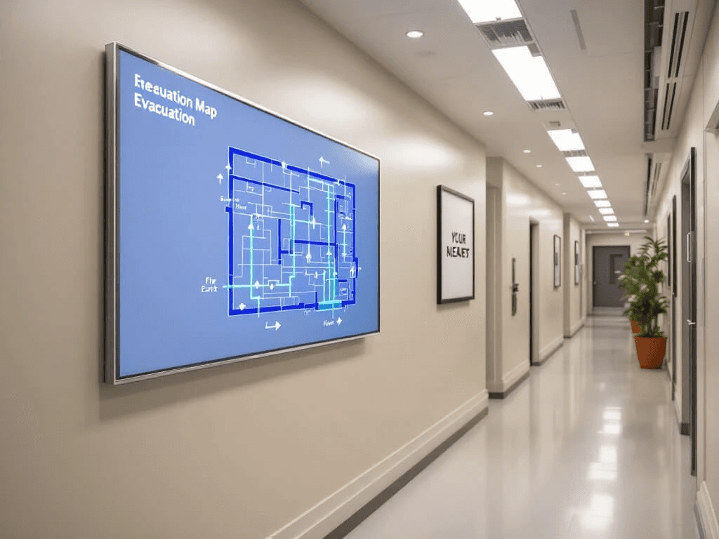 In emergency scenarios, screens can instantly switch to evacuation instructions and safe-zone routing.