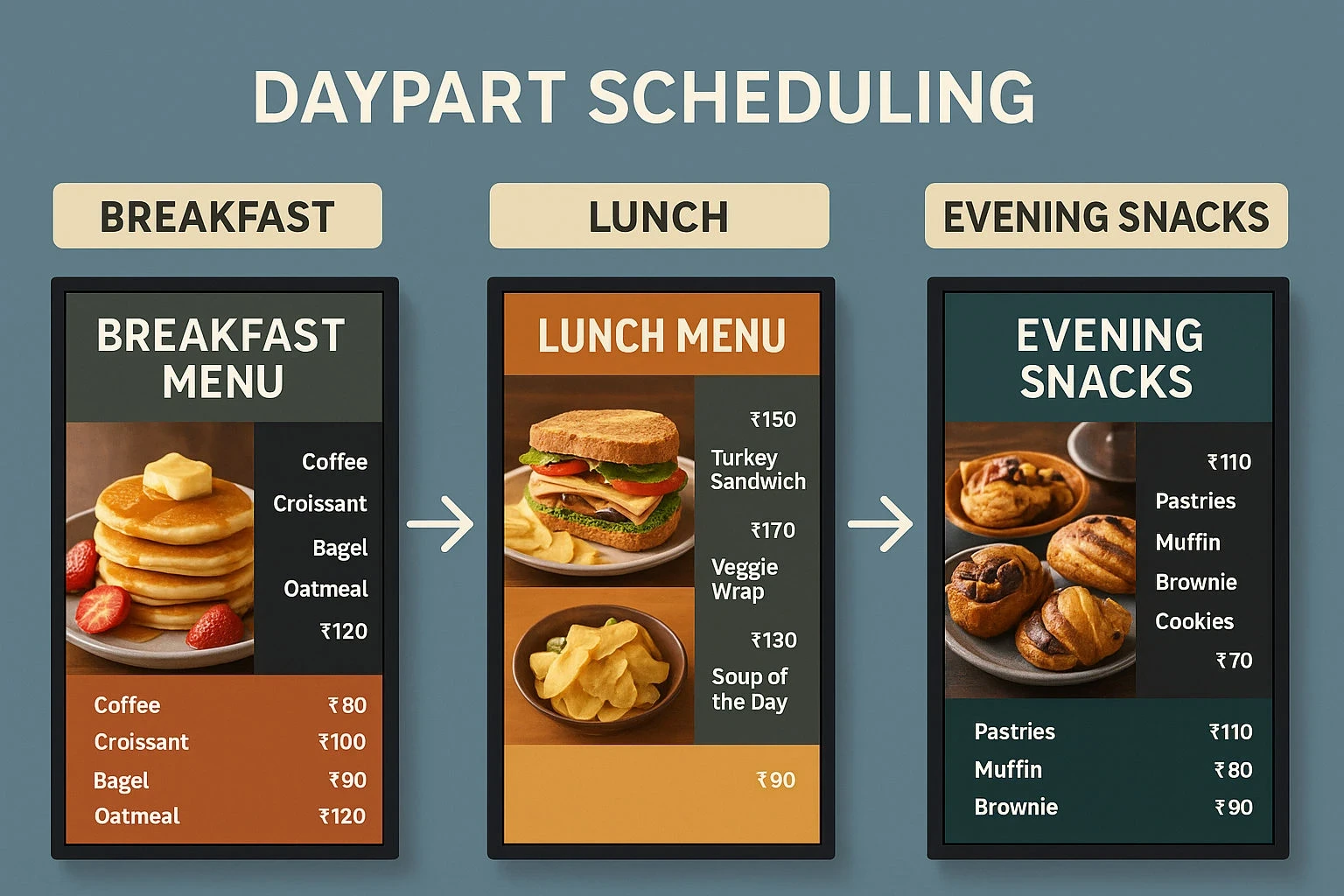 Digital menu boards address the limitations of static signage. With cloud-based CMS platforms, cafés can: